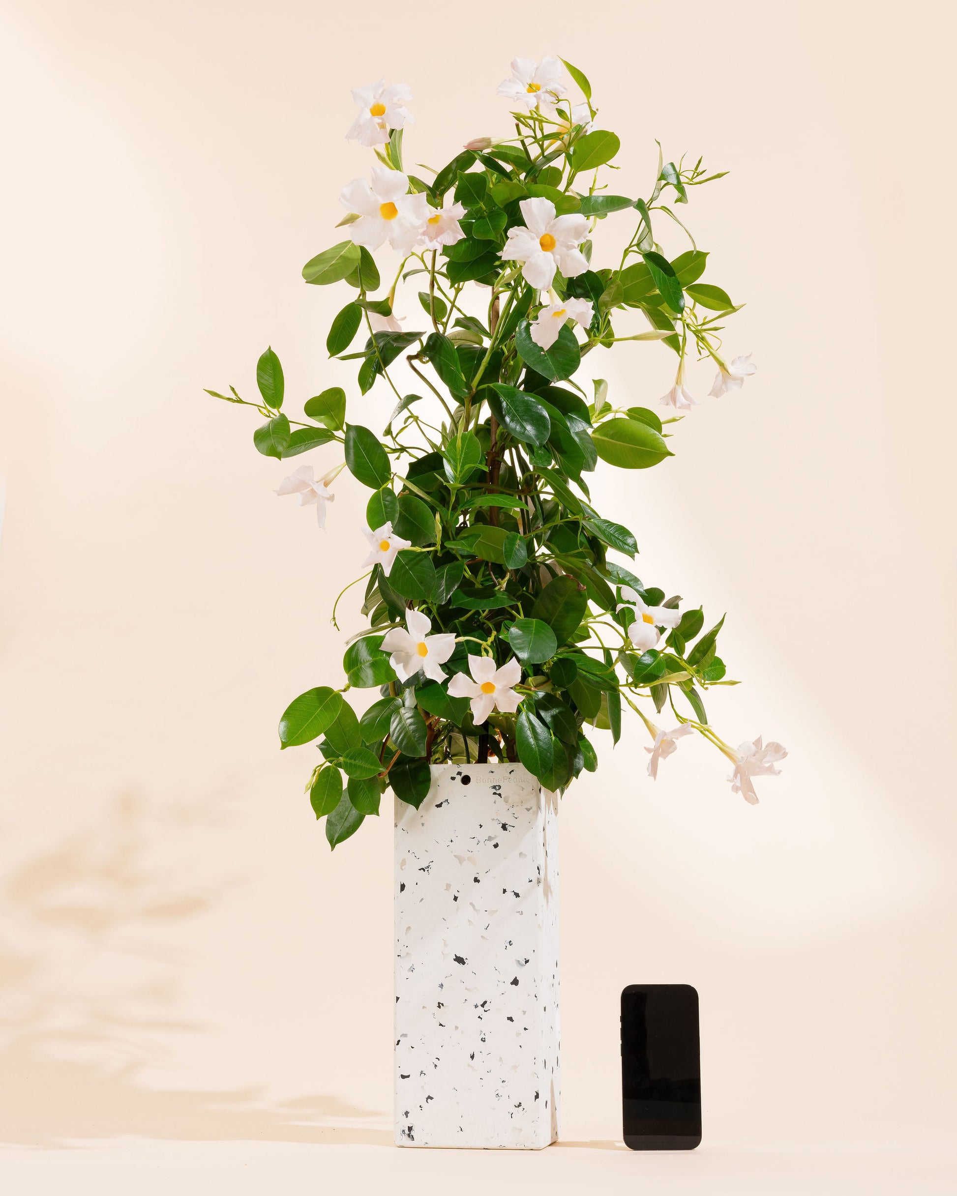 Parlons un peu de Diana, le Dipladénia Sundaville White. Le Dipladénia est une liane au feuillage vert foncé brillant, dont les racines épaisses servent de réserves en périodes sèches. Ses fleurs sont en trompette dans les tons blancs de 4 à 6 cm d’avril à octobre. Mon feuillage ? Je le garde en partie pendant l’hiver