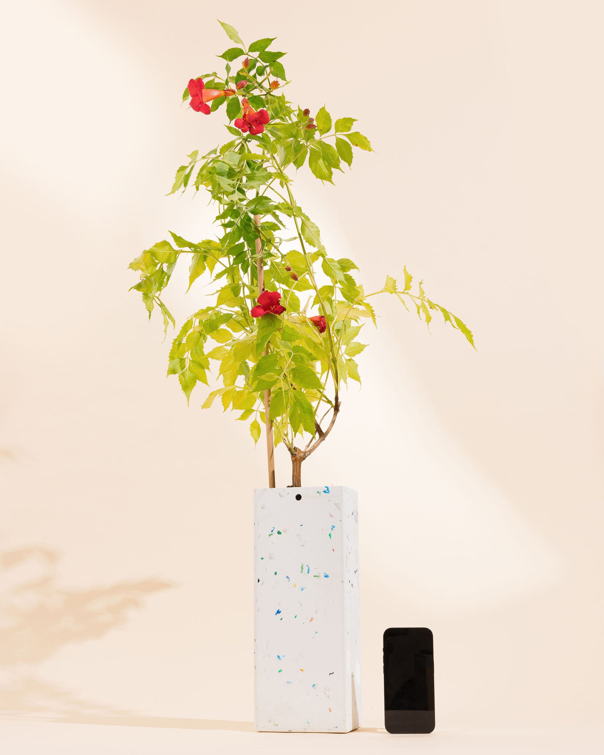 L’innovation BonneFeuille. Nos BonneFeuilles peuvent être livrées dans leurs pots recyclés BonneFeuille adaptés aux fenêtres des villes (H35cm x 10cm x 14 cm), ou dans les pots de notre partenaire Elho, ou si vous le souhaitez sans pot ! Toutes nos plantes d'extérieur vous enverront un message sur WhatsApp lorsqu'elles auront besoin que vous vous occupiez d’elles. Tant que votre abonnement est en cours, votre plante est garantie. Notre abonnement est résiliable à tout moment.